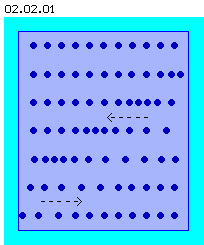 At picture 02.02.01 schematically is shows a section of a medium (e.g. gases or liquids) and some parts within are marked (linearly arranged, in reality molecules naturally would be in chaotic motions). At upper row, same distances represent normal spreading of molecules.