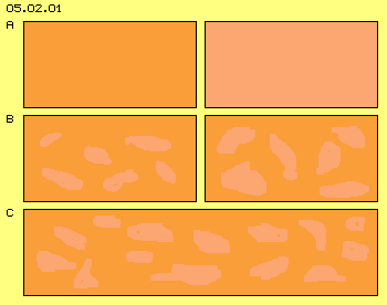 In diesem Bild bei C ist nun die Trennwand zwischen beiden Bereichen entfernt. Teilchen aus dem bislang dichten Bereich werden vermehrt in die Blasen des bislang weniger dichten Bereichs fallen. Im Prinzip findet eine Wanderbewegung von hoher zu geringerer Dichte statt. Nach kurzer Zeit wird überall gleiche Dichte herrschen - pauschal gesehen - während real sich weiterhin ständig Bereiche höchst unterschiedlicher Anwesenheit von Teilchen ergeben, in fortwährend ändernder Form.