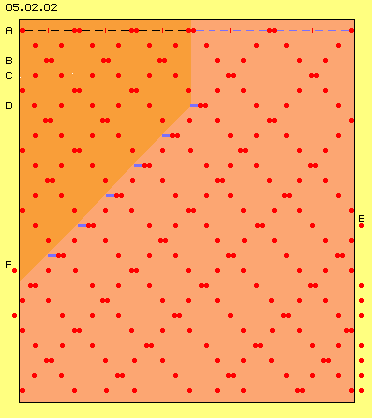 Bei zufälliger Verteilung ist vielmehr sehr wahrscheinlich, dass in einer Box zwei und in einer anderen Box sogar drei Plätze belegt sind. Dann werden zugleich aber drei Boxen völlig unbelegt sein (hellrot markiert). Und wiederum werden zumindest zwei davon neben einander liegen. Auch wenn in viel größerem Raum viel mehr Plätze zu belegen wären, werden ´leere Blasen´ einen großen Teil des Bereichs einnehmen.