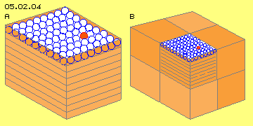 In Bild 05.02.04 bei A ist eine Box von ca. 50 cm Kantenlänge skizziert, in welcher sich in neun Lagen jeweils neun Reihen von jeweils neun Weihnachts-Glaskugeln befinden. Insgesamt sind das 729 durchsichtige Kugeln (hier blau gezeichnet), nur eine ist undurchsichtig (hier rot markiert). Dieses ist etwa die Relation von Wassermolekülen in flüssiger Form (alle Plätze in der Box sind belegt) zu Wasserdampf (das Gas beansprucht das Volumen der ganzen Box, aber nur ein Platz ist belegt).