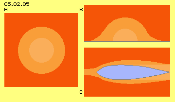 In diesem Bild bei C ist ein wohlbekanntes Beispiel dieses Effekts skizziert: ein ´strömungs-günstig´ geformter Körper (blau). Dieser kann ortsfest in einer Strömung stehen oder sich durch ein ruhendes Fluid hindurch bewegen. In jedem Fall verdrängt er an seiner breitesten Stelle dieses Fluid und dahinter ergibt sich ein Bereich relativ geringer Dichte (hell).