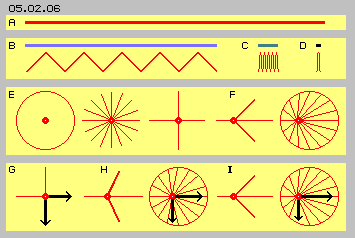 Je schneller die generelle Vorwärtsbewegung ist, desto stärker verlagert sich die Richtung von seitlich- zu vorwärts-weisendem Druck. Bei I ist vorige extrem schnelle Bewegung noch einmal eingezeichnet mit ihrem nochmals reduziertem statischen und erhöhtem dynamischen Druck. Diese Druckverhältnissen werden in der Strömungslehre vornehmlich diskutiert und formelhaft berechnet. Mich interessieren dagegen vorwiegend die Bewegungen und Bewegungsmuster der Teilchen selbst, beispielsweise wenn ungleich schnelle Vorwärtsbewegungen neben einander statt finden.