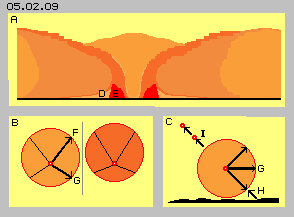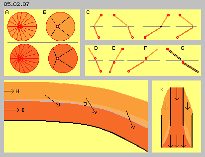 In diesem Bild bei B sind die schematischen Bewegungstypen aus obigem Bild 05.02.07 nochmals dargestellt, mit Blick von oben auf die Strömung. Links von der gedachten Grenze (graue Linie) ist ein Teilchen der langsamen, rechts davon ein Teilchen der schnelleren Strömung skizziert. Die vorwärts-einwärts gerichtete Bewegung (F) des ´langsamen´ Teilchens bewirkt prinzipiell die Beschleunigung der schnellen Strömung, die rückwärts-einwärts gerichtete Bewegung (G) drückt die schnelle Bewegung zusammen.