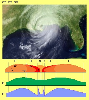 Bild 05.02.08 zeigt oben einen typischen Hurrikan. Darunter ist ein Querschnitt gezeichnet, welcher die bekannten Luftbewegungen schematisch aufzeigt (siehe schwarze Pfeile). Das mittige Auge (D, hell markiert) hat einen Durchmesser von 10 bis 40 km, in welchem die Luft abwärts fließt, schönes klares Wetter und am Boden nahezu Windstille herrschen. In einem Ring (C) am Rand des Auges bewegt sich Luft vehement aufwärts und fließt oben auseinander (dunkelrot markiert). In diesem Bereich (B, rot markiert) herrscht starke Bewölkung mit heftigem Regen.