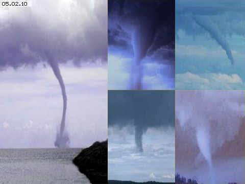 Das Gegenstück zu Wirbelsturm bzw. Hurrikan sind Windhose bzw. Tornado, fünf Beispiele dazu zeigt Bild 05.02.10. Die Windhose links ist voll ausgebildet, aus der Gewitterwolke reicht ein ´Schlauch bzw. Rüssel´ herunter bis zur Wasseroberfläche. Natürlich ist dieser Schlauch nur der sichtbare Teil des Systems und auch um diesen herum bewegt sich Luft in zentripetaler wie tangentialer Richtung.