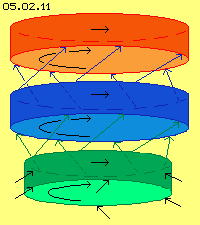 In Bild 05.02.11 ist die anfängliche Drehbewegung in Form einer roten Scheibe schematisch dargestellt (von schräg unten gesehen). Die Luft darunter ist als blaue Scheibe skizziert. Diese könnte anfangs auch vollkommen bewegungslos sein, aber dennoch würden Teilchen daraus zufällig schräg-aufwärts in die Drehbewegung hinein ´verschwinden´ (siehe diagonale blaue Pfeile). Der nachfolgende Prozess entwickelt sich wie oben beschrieben. In die nun ebenfalls drehende Luftschicht (blau) wird wiederum von unten Luft (grün) ´eingesaugt´, jeweils im Drehsinn aufwärts.