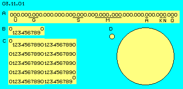 Die Bewegungsabläufe des Äthers im Äther mögen vielen Lesern unglaublich erscheinen, obwohl wir Bewegungen ähnlicher Form ganz real z.B. in Flüssigkeiten oder Gasen beobachten können. Tatsächlich unvorstellbar, d.h. außerhalb unserer konkreten Erfahrungswelt, sind aber die Größenordnungen des Makro- wie des Mikro-Kosmos. In Bild 03.11.01 bei A sind ´Nullen´ auf der Entfernungs-Skala schematisch dargestellt.