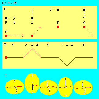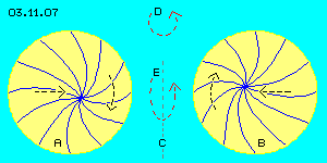 In Bild 03.11.05 sind verschiedene Phasen rein schematisch dargestellt. Bei A ist oben ein Punkt Freien Äthers (F, schwarz) eingezeichnet, wobei die Pfeile seine momentane Richtung (1 bis 4) anzeigen. Anstelle seiner komplexen Spiralknäuelbahn wird hier vereinfachend unterstellt, dass er sich im Prinzip nur nach rechts, dann nach oben, nach links und wieder nach unten bewegt.