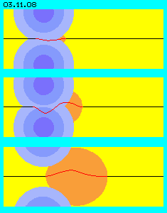 Wenn also die Wolke phasenweise in ihrer Vorwärtsbewegung etwas abgebremst wird, werden Verbindungslinien etwas gestaucht und müssen weiter bzw. rascher rechtwinklig dazu Ausweichbewegungen ausführen, bis hin zur hinteren Seite der Wolke. Wenn nun in nächster Phase momentan gleichsinnige Bewegungen anstehen, können diese ´Spannungen´ sich in entsprechend vehementeren Vorwärtsbewegungen entladen.
