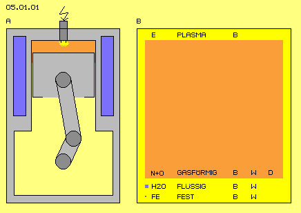 Following section primary talks about well known world of particles and only some differences to the difficult world of the aether are mentioned. At first some known and banal facts are listed, which however become important at following chapters. Our experienced world exists of parts which we handle steady and manifold, e.g. by building machines. At picture 05.01.01 (left at A) very schematic is shown a cross-sectional view through a popular construction - the combustion motor.