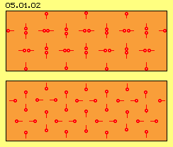 At picture 05.01.02 is marked an area of gas by light red colour. the red points represent atoms. The red line of each atom marks the way moved before. This picture shows no real relations: much too many atoms are arranged at that area, the atoms never show this strict order, the atoms do not move only at these vertical and horizontal tracks.