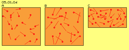 Picture 05.01.04 at A shows some more realistic relations concerning ´chaotic´ directions into which the atoms are moving this very moment. Completely unrealistic however still is the density of atoms (the relation between atom-diameters and total area drawn here). Real relations are not to show at paper or screen, but following example might give good idea.
