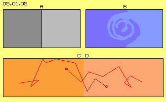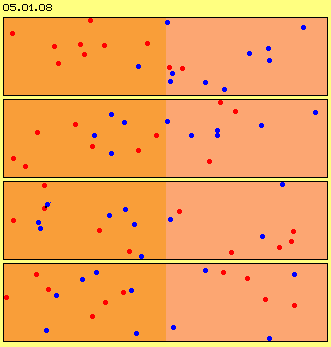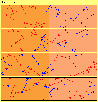 Sometimes I have to excuse for simple examples, sometimes for confusing presentations. This animation for example is rather heavy, because too hard for our visual sense (even showing only two pictures each second). The animation shows left side an area and at the beginning ten red particles are spread randomly. Right area shows correspondingly ten blue particles. Each particle starts moving into arbitrary direction. the animation shows the ´flight-traffic´ by twelve steps and each track moved is marked by lines.