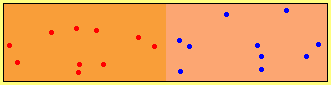 Even this ´airspace is absolutely overcrowded´, the first particles reach the other end already after few ´moves´ (at this example after eight). The mixture is completed after short time (here e.g. red and blue particles are spread likely within both halves after twelve moves). Never ever the particles will be divided like at the beginning.