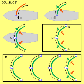 At A the sail (red) is arranged cross to the boat (grey). Also cross to the boat, air is blown along the rear side of the sail. The flow is redirected backward, resulting the thrust force (see arrows). This procedure is not very effective. It would be better to push and move the air direct backward e.g. via prop (even also that technique is not really effective, see chapter ´05.15. Prop- and Jet-Engines´).