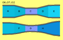 In Bild 06.07.02 sind im Längsschnitt zwei Rohre (grau) dargestellt, oben mit ´normaler´ Verjüngung und Erweiterung, unten in der speziellen Form einer Laval-Düse. Bei A fließt Fluid mit gegebener Geschwindigkeit von links nach rechts, bei B wird das Rohr enger und nach bekannter Gesetzmäßigkeit dabei beschleunigt. Anschließend fließt das Fluid schneller durch das Rohr C, ohne dass hierzu eine entsprechende externe Kraft aufzuwenden war.