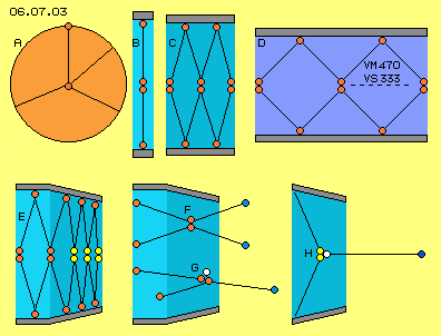 Bei H ist nun eine Kombination voriger Bewegungsmuster dargestellt, die besondere Bedeutung hat, besonders hinsichtlich der Laval-Düsen. Zwei Querschläger (gelb) treffen zufällig im gleichem Moment auf einen Steher (weiß) und beide übertragen ihre kinetische Energie auf diesen ´leichten´ Partikel. Beide bringen ihre normale molekulare Geschwindigkeit ein und beschleunigen damit den ´Dritten´ nicht nur über-schall-schnell, sondern ´über-molekular-schnell´ (maximal auf 2*470 = 940 m/s). Die beiden ursächlichen Partikel werden nur geringfügig zurück gestoßen bzw. werden im Extremfall selbst zu ´ruhenden´ Stehern, während der dunkelblau markierte Partikel - hier ´Raser´ genannt - um so schneller davon fliegt.