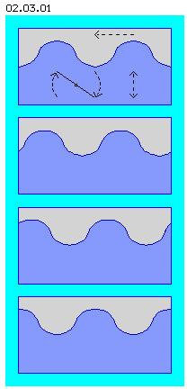 Bild 02.03.01 zeigt schematisch einen Ausschnitt eines Wasserbeckens mit sehr vereinfachter Darstellung von Wellen an der Wasseroberfläche. Rechts von diesem Bild könnte die Wellenbewegung durch obigen Stein ausgelöst worden sein. Die Welle (Berg wie Tal) wandert von rechts nach links durch dieses Bild (markiert durch den oberen Pfeil). Vier Phasen dieser Bewegung sind unter einander eingezeichnet. In der Animation unten ist der Ablauf mit einigen bewegten Bildern visualisiert.