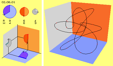 Als Hintergrund aller lokalen geordneten Bewegungsmuster muss aller Freie Äther in sich schwingend sein. Die Bewegungen des Freien Äthers resultieren aus so vielen Überlagerungen, dass seine Bahnen chaotisch erscheinen. Eine erste Vorstellung dieser ´Spiralknäuelbahnen´ soll Bild 02.06.01 ergeben. Drei kreisförmige Bewegungen mit unterschiedlichen Radien (R) und unterschiedlicher Winkelgeschwindigkeit (W) sollen sich jeweils rechtwinklig überschneiden. Ein Ätherpunkt in diesem Raum führt dann die im Bild rechts dargestellte Bewegung auf. In der Animation ist der Verlauf dieser Bewegungs-Mixtur visualisiert.