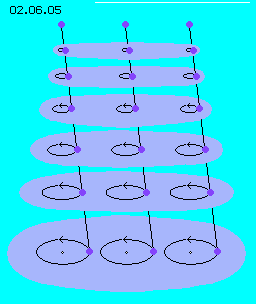 In vorigen Bildern wurde ein Ätherpunkt beobachtet, welcher drei Kreisbewegungen zugleich ausführt. Der Äther ist ein zusammen hängendes Ganzes, d.h. jeder Ätherpunkt hat lückenlos rundherum benachbarte Ätherpunkte. Wenn sich obiger Ätherpunkt auf dieser Bahn bewegt, dann müssen sich alle benachbarten Ätherpunkte parallel dazu ebenso bewegen.