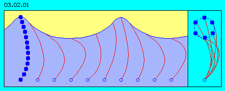 At picture 03.02.01 schematically is shown a section of ´sea with waves´. The first impression probably is, that wave is not drawn exactly. For us, ´nice´ waves are like sinus-waves. At an earlier chapter for example is shown a wave sinus-shaped (produced by throwing a stone into the water). These waves result a lifting and falling at a symmetric process.