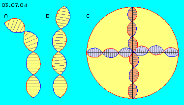 At picture 03.07.04 at A these spiral tracks are drawn once more, here now without the pipe, but with cross-lines between both curves. This double-helix practically represents a standing picture of the fluid-flow or analogue it represents the connecting lines between aetherpoints.