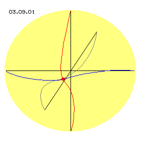 At previous chapters were described movements within Potential-Vortex-Clouds. At picture 03.09.01 this ´cloud´ is marked yellow and three axes of the coordinate system are marked black. There are drawn connecting lines (blue, red, grey) between an aetherpoint near the centre and six ´ends´ of these axes. A simple animation visualizes the swinging motion of the aetherpoint and connecting lines.