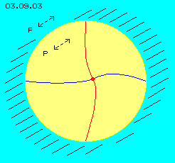 At picture 03.09.03 schematically is shown a Potential-Vortex-Cloud (P) and its internal movements are symbolized by two connecting lines. Around this cloud is Free Aether (F). Instead of its most complex pattern of movements, here simply is assumed the Free Aether is only moving diagonal to and fro.
