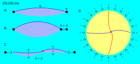 At picture 03.09.04 at A schematically is shown a connecting line (S, blue) with a simple swinging motion inclusive its area of movement (light blue). Free Aether (F) at both ends of that ´violin-string´ swings comparably minimum distances, so here marked as a (nearby) resting aetherpoint (black).