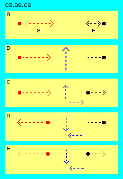 At first however once more the mutual interactions between a Potential-Vortex-Cloud and the Free Aether are discussed. At picture 03.09.06 at A are marked a swinging aetherpoint (S, red) of a connecting line and a point of Free Aether (F, black). Simplifying is assumed, both are moving only horizontal to and fro. Different long ways are marked by different long arrows. Motions at the very moment can be into likely direction or into contrary directions. Four situations in principle are possible and shown at rows B to E. The resulting effects are marked by blue arrows between both points.
