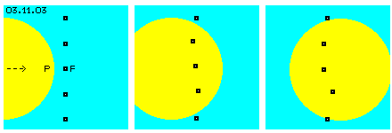 At picture 03.11.03 now is shown a single Potential-Vortex-Cloud (P, yellow), moving from left to right at these three parts of picture. The resting aether (relative to this motion-ahead) is marked by five black points (F). This ´Free´ Aether does only the Universal Aethermovement at short distances, so here is assumed to be stationary.