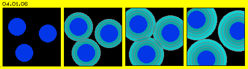 Das Problem der Grenze zwischen Etwas und Nichts (bzw. dessen was außerhalb von Etwas sein müsste) stellt sich aber keinesfalls nur an der Außengrenze des Universums, sondern unzählige Male innerhalb des Alls und unserer Welt. Nach geltender Lehre ist nicht nur das All leer, sondern gibt es ´Vakuum´ zwischen allen Teilen. Egal ob Sonnensystem oder Atom, immer unterstellt man einen materiellen Kern (plus Planeten oder Elektronen oder Ähnliches) - und dazwischen Nichts. Irgendwelche Teil sind hier in Bild 04.01.06 und der Animation wieder durch Blau repräsentiert, dazwischen das schwarze Nichts.
