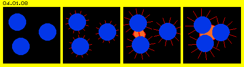 In Bild 04.01.08 und in dieser Animation sind drei materielle Teile (blaue Etwas) skizziert, schwimmend im Nichts (schwarze Leere). Irgendwie müssen die Teilchen miteinander Kontakt aufnehmen, hier symbolisiert durch rote ´Fühler´. Wenn sich diese (magnetische) ´Feldlinien´ treffen, entwickeln sie die Tendenz sich zu verkürzen bzw. generell die Distanz zwischen den Teilchen zu verringern. Wie sie das bewerkstelligen - bleibt ihr Geheimnis.