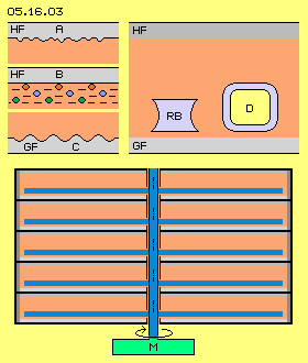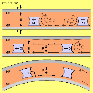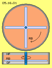 The following picture 05.16.02 shows sections of the area between the stick-face and glide-face (HF and GF). The rotor blades (RB, light blue) are rotating above the glide-face rotate, here moving from right to left. The profile of these blades is flat upside and below, the left and right faces however are concave.