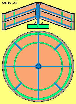 All lifting forces push the even stick-faces upward, so they must be build rather stiff. Much more stable are faces of a truncated cone. So it would be advantageous to build these boxes in shape of cones. Picture 05.16.04 upside shows a longitudinal cross sectional view through the system axis. Several layers can be piled up also at this version, all rotors mounted at one shaft and driven by one motor (M, green).