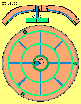 In order to build a most stable and light construction, one should avoid a central shaft. The bowl-like stick- and glide-faces can be build throughout over the centre. The rotor no longer reaches to the system axis, but ends at a gear-rim (ZK, dark green). A gear wheel (ZR, dark blue) is installed at a shaft, driving the rotor.
