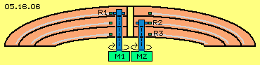 Picture 05.16.06 shows this variation with a schematic cross-sectional view. Here are assembled three rotor layers (R1, R2 and R3) with different radius, one within the other. The stick- and glide-faces of the middle layer are direct connected with the faces of the upper and below layers. All boxes are connected below-outside. Also at the middle, all faces are fix connected with a pipe (yellow). These round and curved sheets build a most stable body.