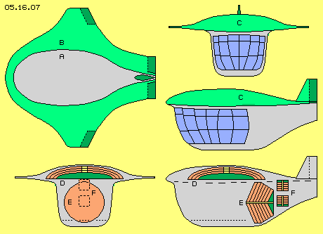 At the below row of that picture are drawn the positions of different engines. The lift-engine (D, red) is installed within the dome, here e.g. with three bowls integrated one within the other. The area for the drive-units of the rotors is marked green.