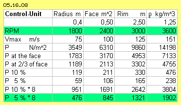 Table 05.16.08 shows data of the control-units sketched at previous helicopter (picture 05.16.07 at F). The rotor radius is 0.4 m, two units with each four disks are installed, thus eight pairs of effecting faces. The table shows results of 1800 up to 3600 rpm (thus with 75 m/s up to 150 m/s). Suitable thrust-forces come up already by 5 % differences (marked green). Double revolutions increases the forces by square, certainly sufficient for this helicopter.