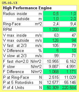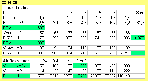 This engine could be build some smaller or could produce much more forces, like mentioned upside. Instead of the normal air pressure, it could drive with ´thick´ air (e.g. with rho=2 kg/m^3, factor 1.5). At this advantageous bowl-shape, the difference of speeds will not be only 5 % (like calculated here), but also 10 % or even more (factor 2 to 3). Resulting would be forces up to 40 kN - opening quite new possibilities.