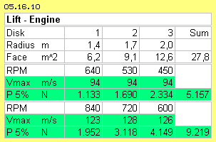 At this table, the lift forces are calculated for speeds of each 94 m/s and again one third faster (123 m/s, 128 m/s and 126 m/s). Resulting are lift forces of about 5000 N up to 9000 N (marked green). So a helicopter of five tons could hover. Even if the big rotor would fail, both smaller rotors could produce sufficient lift.