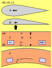 Right side below at H, an other advantage of the curvature is sketched: as the air movement generally is directed tangential, the air particles of the inner track fly outwards and relieve the glide-face. Opposite, the air particles at the outside track crash at the wall, affecting stronger pressure at the stick-face.