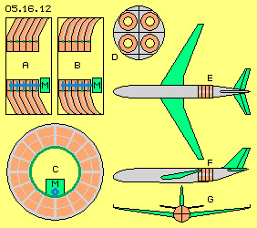 At picture 05.16.12 are sketched relative large engines, at A and B by longitudinal cross-sectional view through the system axis. A view at the rotor-cage is shown at C. As an example, D and G shows how four units could be installed side by side within the fuselage on an airliner. Four units could be arranged one behind the other at the rear part of an airliner, like marked at E and F.