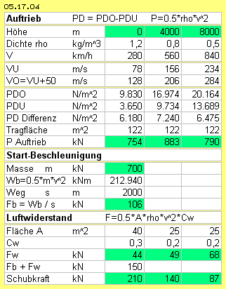 Bei der Ermittlung des Auftriebs wird unterstellt, dass die Strömung entlang der Oberseite um 50 m/s schneller ist. Der dynamische Strömungsdruck ist für die obere und untere Fläche berechnet (PDO und PDU). Die PD-Differenz bezogen auf die Trag-Fläche von 122 m^2 ergibt den jeweiligen Auftrieb (P-Auftrieb).