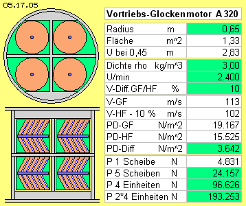 Der Radius des Rotors ist 0.65 m, der eine Fläche von 1.33 m^2 bestreicht. Gewichtete Durchschnitts-Werte sind bei einem Radius von 0.45 m gegeben, bzw. einem Umfang von 2.83 m. Die Leistung kann reguliert werden über die Dichte, wobei das System z.B. mit rho = 3 kg/m^3 zu fahren ist. Die Leistung ist auch zu regulieren über die Drehzahl, die hier z.B. mit 2400 U/min angesetzt ist. Die Differenz der Strömungsgeschwindigkeiten entlang der Gleit- und Haftflächen (GF und HF) ist nur empirisch zu ermitteln. Bei Tragflächen erreicht sie 60 % bis 25 %, hier werden nur 10 % unterstellt.