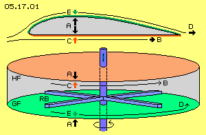 These processes are rebuild within the closed system of the air-pressure bowl-engine. Its general shape is a round hollow cylinder, like sketched at picture 05.17.01 below. The normal atmospheric pressure weights at all outside faces, force neutral in total (see arrows A). A rotor (blue) produces and maintains the ´artificial wind´. Its rotor-´blades´ (RB) are a right-angle profile, working not like normal props. They only keep the air steady rotating. The rotor-blades are moving above the below inner face by a short distance. This surface is most smooth, here called ´glide-face´ (GF, green). The distance to the inner face above is some larger. This surface is most rough, here called ´stick-face´ (HF, red).