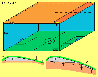This mechanistical view is most common and it´s also suggested, the air upside of the wing would be drawn down, and behind the wing even deeper - so the aircraft correspondingly would rise up. Picture 05.17.02 once more shows previous profile A: the air is lifted at the front side, before falling down at the rear end (see arrows). Might be the air later will go on falling down, however with no importance for the lift (because up there are no mechanic lever-arms for balancing forces).