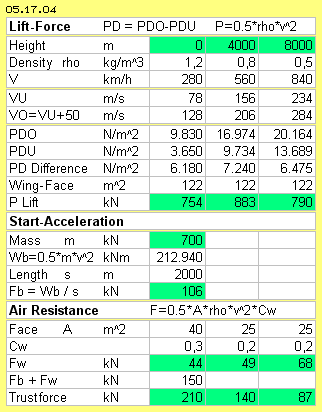 It´s realistically assumed, the flow along the upper face is faster by 50 m/s than along the face below. The dynamic flow-pressures are calculated for the upper and lower faces (PDO and PDU, O=oben=up, U=unten=below). The PD-difference is multiplied by the wing-face of 122 m^2, resulting the lift-force (P-Lift).