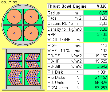 This process and the effects of pressure differences can also be realized within a closed system. The wings produce forces in vertical direction. Likely forces can be directed horizontal within a closed box. A bowl-engine thus can serve for the drive of an aircraft, e.g. like sketched at picture 05.17.05 and shown by data for an A320 airplane.