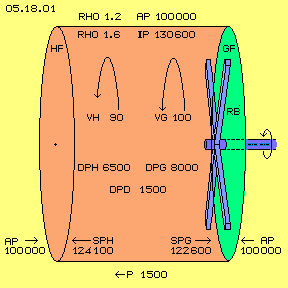 The hollow cylinder is 1 m long and the side faces are 1 m^2, thus the cylinder contains a volume of 1 m^3. The right face is smooth and is called ´glide-face´ GF (green). The mantle of the cylinder is a rough surface and also the left side face, which is called ´stick-face´ HF (red). Rotor-blades RB (blue, simple square profiles) near to the glide-face are rotating with about 2400 rpm, so the air is moving at VG = 100 m/s (as a weighted average) at circles on and on. Further left, the flow is decelerated by friction, so the air near the stick-face rotates slower, e.g. only with VH = 90 m/s.